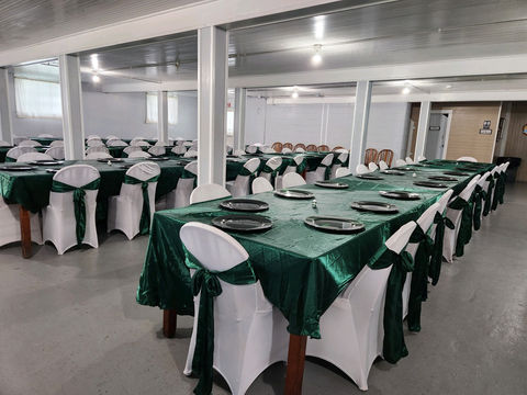 Two floors: Ball Room, great for parties, dancing, weddings and more. Basement for gatherings, dining and has kitchen/serving area.